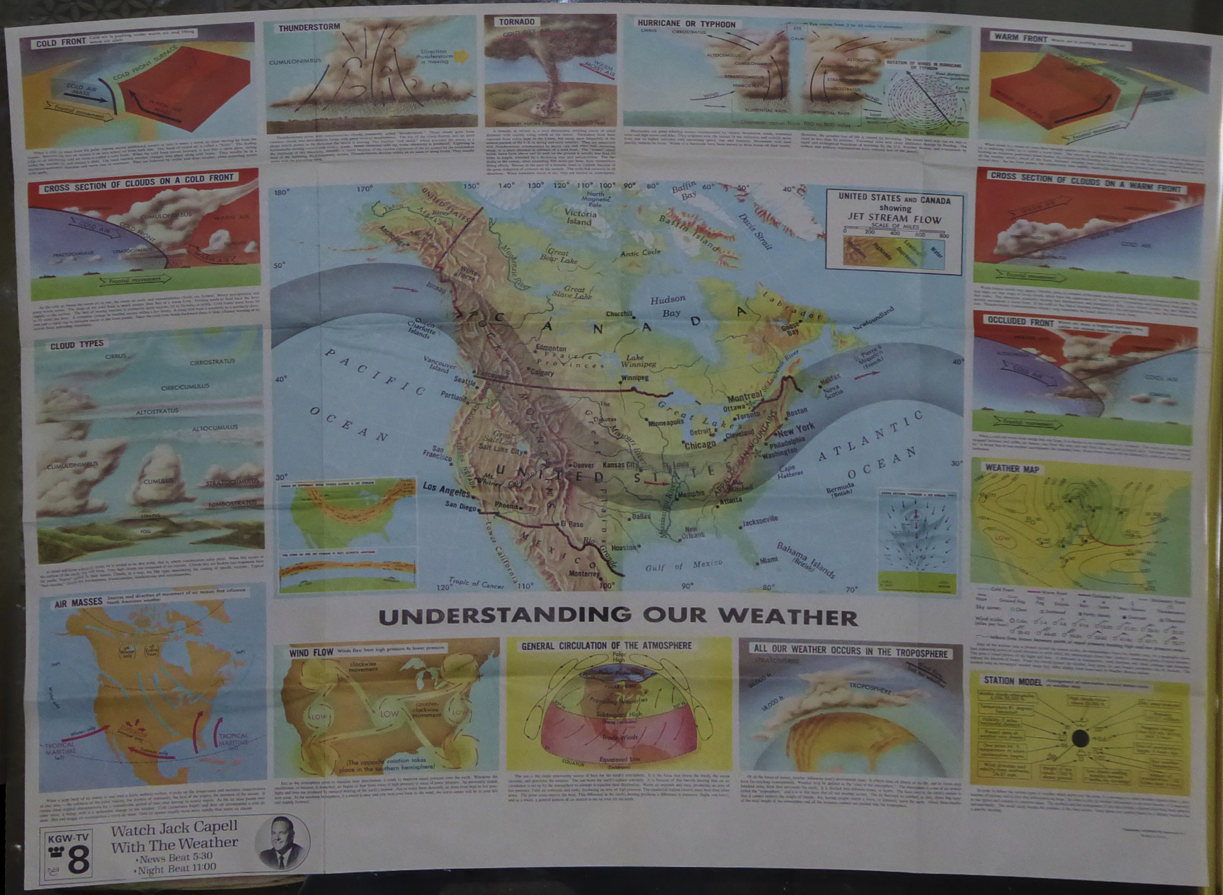In the 1960’s, KGW meteorologist Jack Capell put together a two piece KGW promotional set that consisted of a vinyl record and large weather map. These items were handed out together. Those who were able to acquire one of these sets could listen to the record while following along on the map, learning about weather patterns all across the United States. This particular set was found in the basement of a Vancouver, WA. home in 2016. It had been stored in a box for more than 50 years and was likely never listened to. Although as time has passed and the audio has degraded in quality, it is still enjoyable to listen to while viewing the map. We hope you enjoy these two downloads. The audio file in approx 75MB.