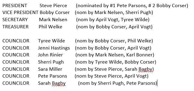 It was wonderful to see 35 members at our first in-person meeting in 2 years on Wednesday March 16th. Lots of weather conversation, plus good food and drinks, made for a fun evening. Nominations were held for our annual spring election too. The ballot, which will show up in your email, will feature: